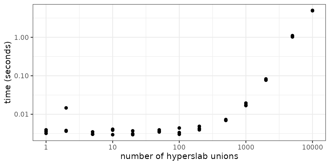 As we can see this is massively slower than the previous example. This is because creating unions of hyperslabs is currently very slow in HDF5 (see Union of non-consecutive hyperslabs is very slow for another report of this behaviour), with the performance penalty increasing exponentially relative to the number of unions. When we use the index argument rhdf5 creates a hyperslab for each disjoint set of values we want to extract and then merges them. In our first example this only require the creation of a single 100 \(\times\) 10,000 hyperslab, where as in the second case we require 10,000 hyperslabs of dimension 100 \(\times\) 1 and 9,999 merge operations.