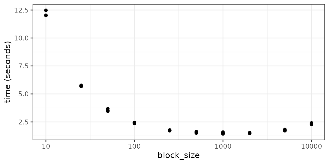 We can see this has a significant effect, although it’s still an order of magnitude slower than when we were dealing with regularly spaced subsets. The efficiency here will vary based on a number of factors including the size of the dataset chunks and the sparsity of the column index, and you varying the block_size argument will produce differing performances. The plot below shows the timings achived by providing a selection of values to block_size. It suggests the optimal parameter in this case is probably a block size of 1000, which took 1.43 seconds - noticeably faster than when passing all columns to the index argument in a single call.